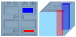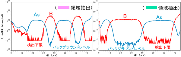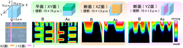 市販品MEMSについて、BとAsの三次元イメージングSIMS測定を行いました(測定領域:75μm角、深さ:約1.5μm)。測定後のデータ処理により、任意断面・任意深さの面分布、任意領域の深さ方向分布、任意箇所のラインプロファイルの抽出が可能です。