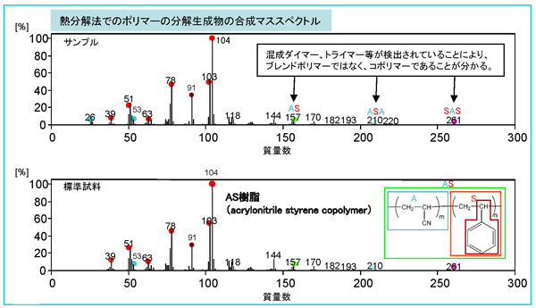 TG-DTA(熱重量-示差熱)分析とGC/MS分析を併用することで、最適な温度条件を選んで未知の高分子材料及び含有する揮発性有機化合物をそれぞれ同定することが可能です。市販製品のプラスチック部分の熱分解温度を調べ、熱分解温度以下での緩やかな昇温(熱脱着法)と、その後の高温での瞬間加熱(熱分解法)の2条件でGC/MS測定を連続的に行うこと(ダブルショット法)により、このプラスチックはAS樹脂であり、添加剤として酸化防止剤:IRGANOX 1076が含まれていることがわかりました。