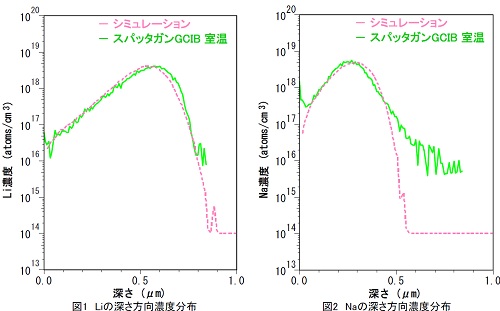 スパッタイオン源にGCIBを用いてLiおよびNaの深さ方向分析をTOF-SIMSで行った結果を図1,2にまとめます。 その結果、Liに関してはシミュレーションとも良く一致しております。 Naに関してピークトップ近傍は同じ分布を示しておりますが、ノックオンの影響などで深さ方向にダレが生じております。