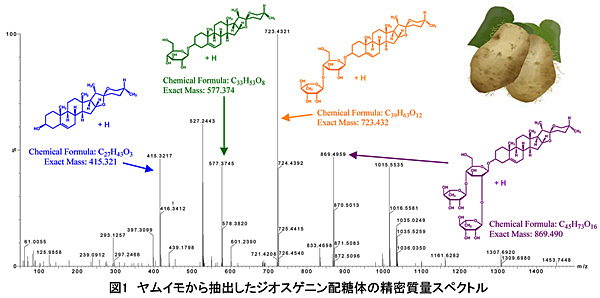 ジオスゲニンは滋養強壮作用に加えて、アルツハイマー病の改善効果や運動機能を高める効果も近年報告されており、注目されている成分です。天然のジオスゲニンは主に配糖体として存在しており、食品の中ではヤムイモに多量に含まれています。本事例ではヤムイモの抽出物をLC/MSで定性分析を行い、複数のジオスゲニン配糖体を確認しました。また、配糖体を加水分解してアグリコン(非配糖体)に統一することで、ジオスゲニンの定量分析も可能となります。