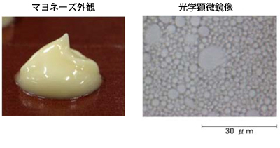 エマルションは、水溶成分と脂溶成分を乳化剤の作用により分離なく混合した分散系であり、種々のエマルション技術が加工食品に広く利用されています。マヨネーズはその中でもO/W型(水中油滴型)の代表的な加工食品です。クライオFIB-SEM観察による評価を行った結果、水分・油・乳化剤などの分布を可視化することができました。拡大観察によって微細構造の評価を行うことができ、食品の滑らかさや風味などの食味評価に応用することが期待できます。