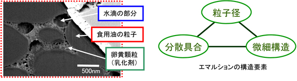 水の昇華と組み合わせたクライオFIB-SEM観察によって、エマルションの構造要素である粒子径・分散具合・ナノオーダーまでの微細構造を評価することができました。