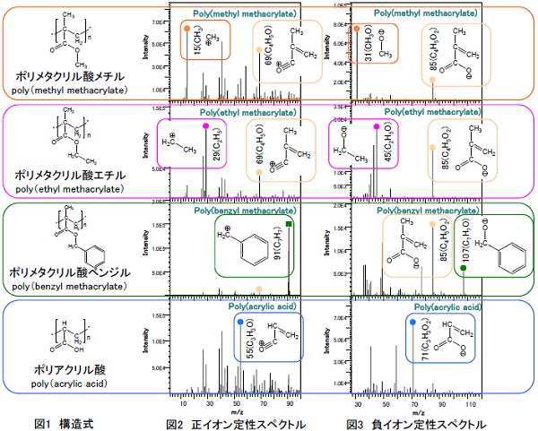 アクリル樹脂は、ケイ酸塩ガラスに比べ、加工性・透過率・安全性などが優れているため、有機ガラスとして航空機や自動車などの窓ガラス、レンズやプリズムなどの光学用器具・医療用材料・日用品・工芸品などの広い用途があります。代表的なアクリル系の標準試薬について、TOF-SIMSで質量スペクトルを取得しました。MSTでは分析対象の質量スペクトルと標準試薬の質量スペクトルとを比較することで、検出されたフラグメントイオンから、アクリル樹脂の推定が可能です。