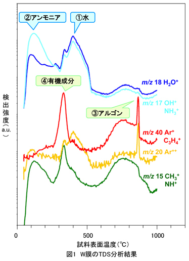 Si基板上W膜のTDS分析結果を例に、水とアンモニア(m/z=17)、有機物とアルゴン(m/z=40)の成分推定方法について説明します。