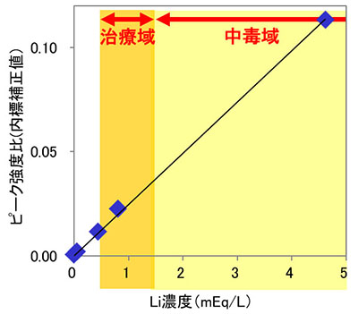 ICP-MS (誘導結合プラズマ質量分析)法による分析では治療域未満の濃度から中毒域まで広範囲での血中のLi濃度の定量が可能です。