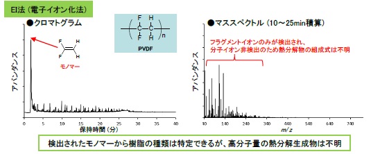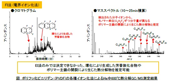 フッ素樹脂は耐候性、耐薬品性、撥水性、絶縁性などの優れた特性を有し、コーティング剤や電子部品に利用されています。樹脂の熱分解物の評価においては、熱分解GC/MS法が有効ですが、汎用のイオン化法(EI法) ではフッ素樹脂の熱分解物はほとんど分子イオンが検出されないため定性は困難でした。本事例では、ポリフッ化ビニリデン(PVDF) の熱分解生成物について、2種類のイオン化法(EI法、FI法) を併用することで、詳細な解析を行いました。