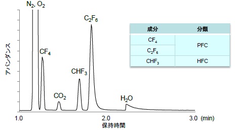 フロンガスは化学的に極めて安定、かつ、人体への影響が小さいといった性質から、冷媒、発泡剤、半導体、及び、精密部品の洗浄剤など、様々な用途で活用されています。その一方で、オゾン層の破壊や地球温暖化につながる物質であるため、法律で規制されています。本事例では、GC/MSにてフロンガスを分析し、PFCの中でも極性が低く分離が難しいCF4の分離分析を行いました。GC/MSを用いることにより、特定フロンのCFC、HCFCや、代替フロンのHFC、PFCを定性的に分析することが可能です。