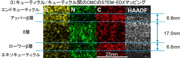 毛髪細胞膜複合体(CMC)は、毛髪のブリーチや毛染めなどの際に薬剤の通り道として利用されます。特にキューティクル/キューティクル間のCMCは3層構造を有しており、この可視化を行いました。 四酸化オスミウム(OsO4)で、脂質中の不飽和脂肪酸を狙って電子染色を行いTEM観察及びSTEM-EDX分析をした事例を紹介します。