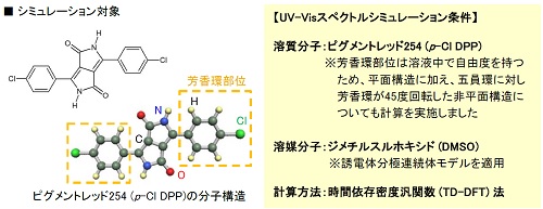 ピグメントレッド254(p-Cl DPP)は鮮明な赤色を呈するDPP(ジケトピロロピロール)顔料の一種です。DPP顔料は優れた耐候性を有する赤色顔料として用いられ、さらに大量生産しやすく低コストのため有機EL材料としての活用も期待されています。本資料では溶液中のピグメントレッド254を対象に量子化学計算に基づくUV-Visスペクトルシミュレーションを実施した事例を紹介します。シミュレーション結果を参照することで、実測データのスペクトル形状を解釈することができます。