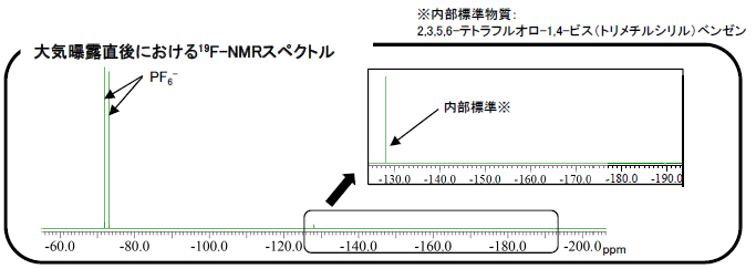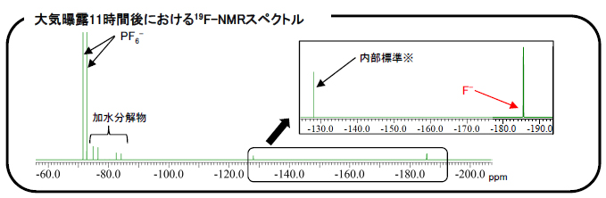 大気非曝露条件下で調製した電解液を、湿度70%RH・気温17℃の大気中に11時間曝露し、生成したフッ化物イオン濃度を19F-NMRを用いて評価しました。またフッ酸を含んだ溶液はガラスを溶出させるため、本分析ではPTFE製の試料管を用いて磁場調整を行うことで定量分析を行いました。