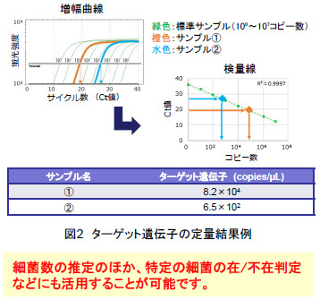 細菌が持つ特定の遺伝子をターゲットとし、PCR(ポリメラーゼ連鎖反応)を利用して遺伝子のコピー数を定量し、そこから細菌数を推定します。