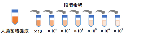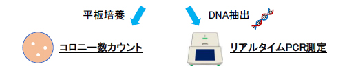 大腸菌培養液を段階希釈してコロニー数カウントを行い、菌数を算出しました。それと同時に、大腸菌培養液それぞれからDNA抽出を行い、リアルタイムPCR法にてふたつのターゲット遺伝子(※)の測定を行い、結果を比較しました。