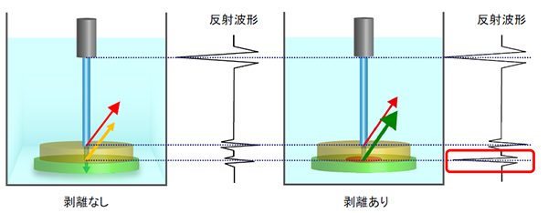 異なる材質の界面では音響インピーダンスが変化し、反射強度が変わります。この反射強度は、材質ごとの音響インピーダンスの差に比例して大きくなり、空気層では極めて強い反射が起こります。また、音響インピーダンスの大きい物質から小さい物質への界面では反射波形の位相が反転します。