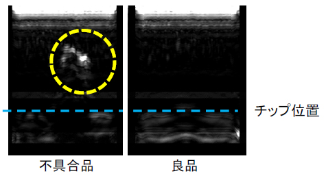 音波を用いることから試料の光学的な性質に左右されず、試料表面だけでなく、表面下の内部構造も非破壊で観察する事が可能です。空気との界面での反射が大きいことから、電子部品のパッケージ内部などに存在する空隙やクラックを高感度で観察できます。空隙箇所の判定は、各測定箇所における超音波の反射波形から判定します。