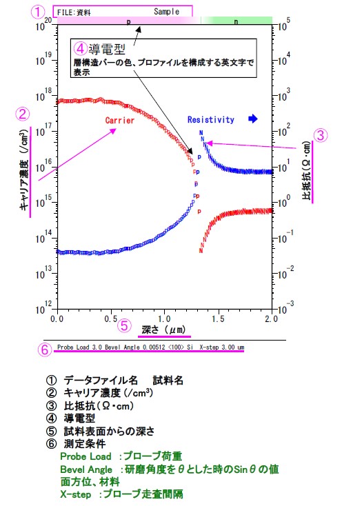 | 測定範囲 | 導電型(p型/n型)の判定を含む深さ方向のキャリア濃度分布の評価が可能 |