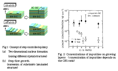 - 1) In 1987, the step-controlled epitaxy method was proposed, making it possible to manufacture high-quality SiC single crystal layers using chemical vapor deposition (CVD), at a temperature lower by 300℃ or more, which previously had not been possible. The basic concept involved the use of a substrate inclined several degrees off from the SiC crystal surface (0001) and the application of step flow growth to easily transmit the substrate's complicated laminated structure to the growth layers (Fig. 1). With crystals to which no impurities were added, a high degree of purity – ppb(10-9) – was obtained (Fig. 2). By adding impurities during growth, a precise conductivity control method was established for p-types and n-types. From various evaluations, not only were the superior aspects of this method demonstrated, through the outstanding crystallinity of the growth layers and the like, but detailed research was done on crystal growth mechanisms and an academic context provided.