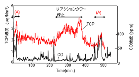 図1 リアクションタワーの停止に伴う排ガス中ダイオキシン前駆体(トリクロロフェノール、TCP)の濃度変化