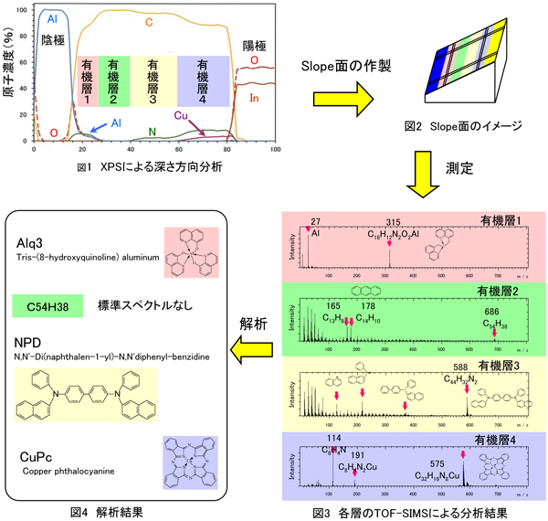 XPSで4層の異なる有機化合物(或いは有機金属錯体)で形成されていると推定された有機EL素子(図1)について、TOF-SIMS分析を行いました。多層構造試料についてはスパッタを併用した深さ方向分析も行われますが、今回は構成成分の結合を壊さずに測定するために、Slope面を作製して各層を露出させました。Alq3, NPD, CuPcと推定される分子量関連イオン・フラグメントイオンが得られ、Slope面のTOFSIMS分析が有機多層膜の成分分析手法として有効な手段であることが確認されました。