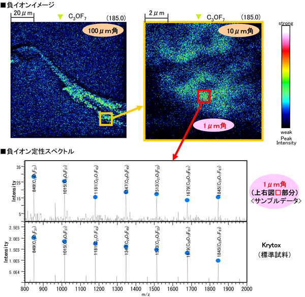 撥水処理における撥水面の状態は、フッ素系化合物が島状(アイランド状)に分布しているか均一に分布しているかの違いで異なります。そこで、TOF-SIMSを用いて、フッ素系化合物の分布の観察を行いました。その結果、不均一に分布していることがわかりました。また、1μm角の領域で定性分析を行うことで、フッ素系膜はKrytoxであることがわかりました。