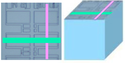 市販品MEMSについて、BとAsの三次元イメージングSIMS測定を行いました(測定領域:75μm角、深さ:約1.5μm)。測定後のデータ処理により、任意断面・任意深さの面分布、任意領域の深さ方向分布、任意箇所のラインプロファイルの抽出が可能です。