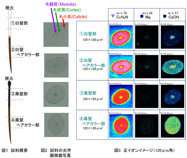 毛髪の断面からは白髪・黒髪ともにケラチン由来のC4H8Nが検出されました。