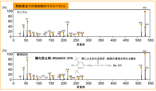 TG-DTA(熱重量-示差熱)分析とGC/MS分析を併用することで、最適な温度条件を選んで未知の高分子材料及び含有する揮発性有機化合物をそれぞれ同定することが可能です。市販製品のプラスチック部分の熱分解温度を調べ、熱分解温度以下での緩やかな昇温(熱脱着法)と、その後の高温での瞬間加熱(熱分解法)の2条件でGC/MS測定を連続的に行うこと(ダブルショット法)により、このプラスチックはAS樹脂であり、添加剤として酸化防止剤:IRGANOX 1076が含まれていることがわかりました。