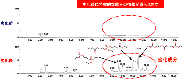 さらに、劣化後に特徴的な成分をLC/MS/MS分析することで劣化試験により生成したと考えられる成分を推定することが出来ました。