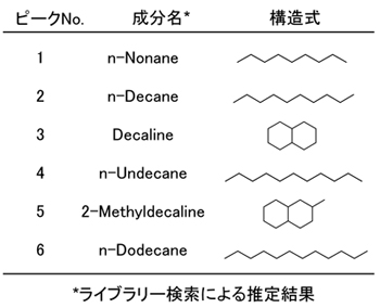 主要なピークとして、C9~C12の脂肪族炭化水素と脂環式炭化水素が検出されました。
