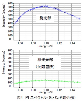 太陽電池に禁制帯幅以上のエネルギーの光を照射するとキャリアが生成し、一部は発光性再結合をします。その際の発光をフォトルミネッセンス(PL)と呼びます。しかし、欠陥が存在する箇所では、キャリアが捕捉されPL強度が弱くなります。このことから、PLマッピング測定をすることで、非破壊かつ簡便に欠陥箇所を特定することができます。多結晶シリコン太陽電池セルにおいて、PLマッピング測定を行い、欠陥箇所を特定した事例を以下に示します。